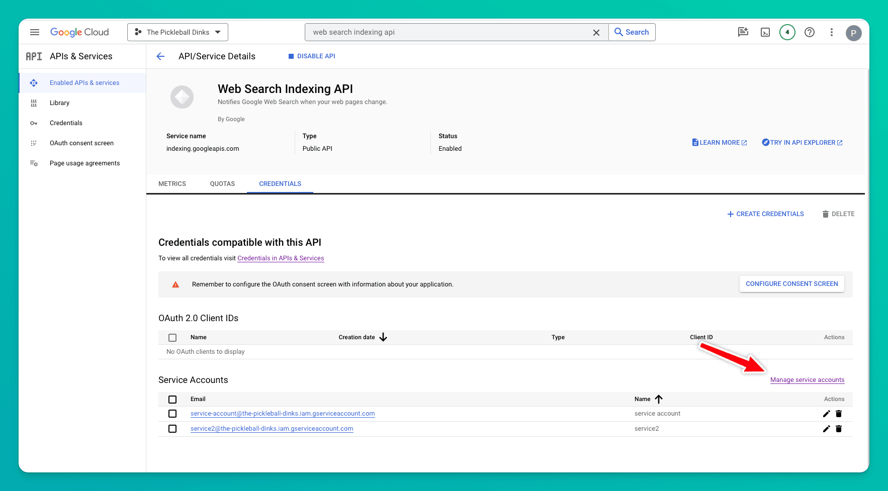From the web search indexing api page, go to Enabled APIs & services -> Credentials -> Manage service accounts